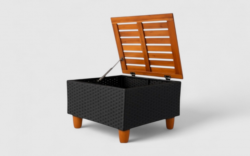 Constructed from 100% FSC acacia wood and durable black wicker plastic, it provides a stable structure with a warm teak tone.
