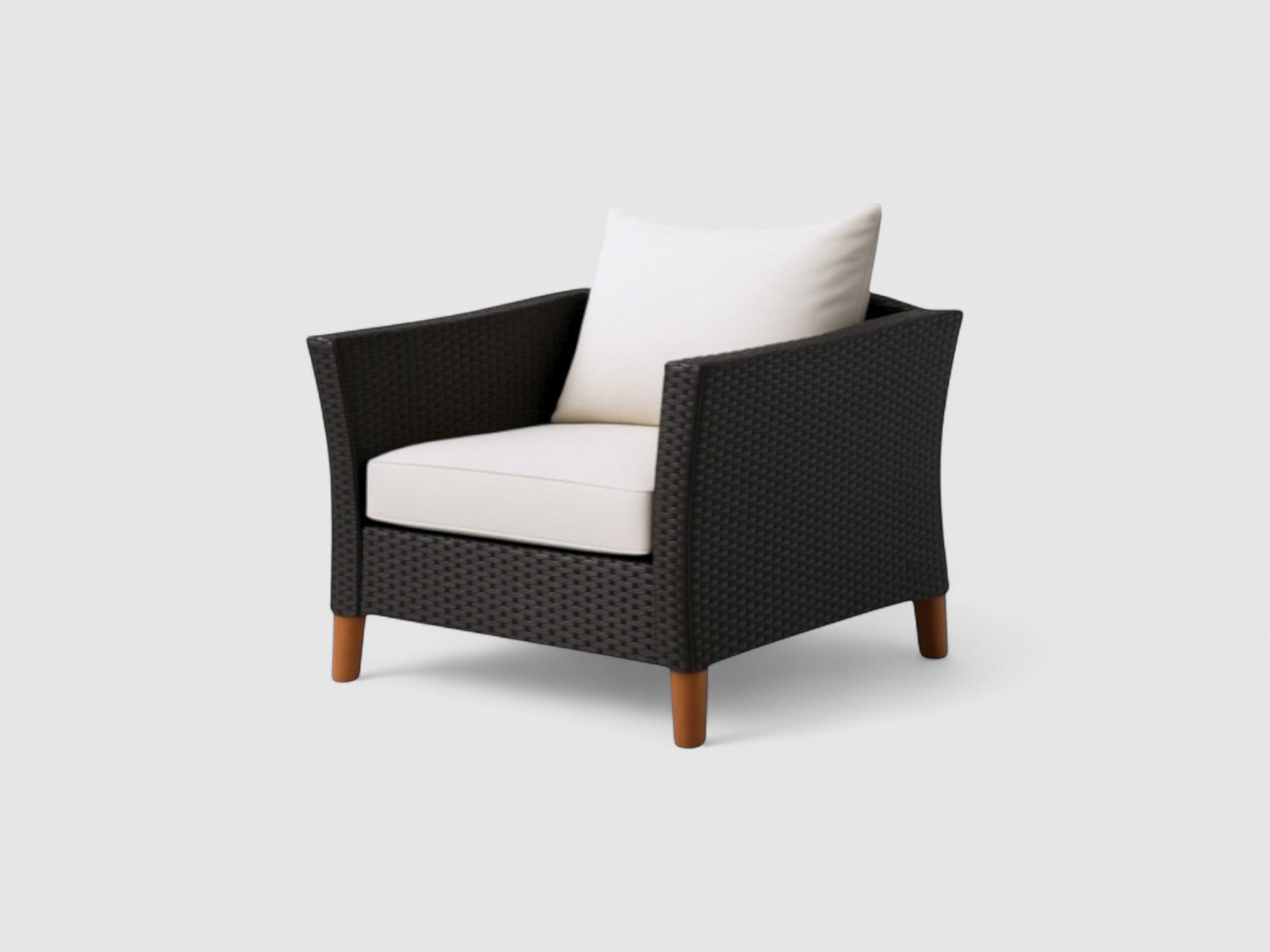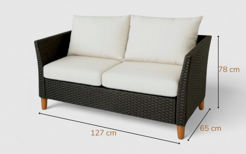 The Nathan Sofa Set 4 brings refined sophistication to your outdoor space. Combining the natural warmth of wood with the durability of black wicker plastic, this set is designed for both comfort and longevity.