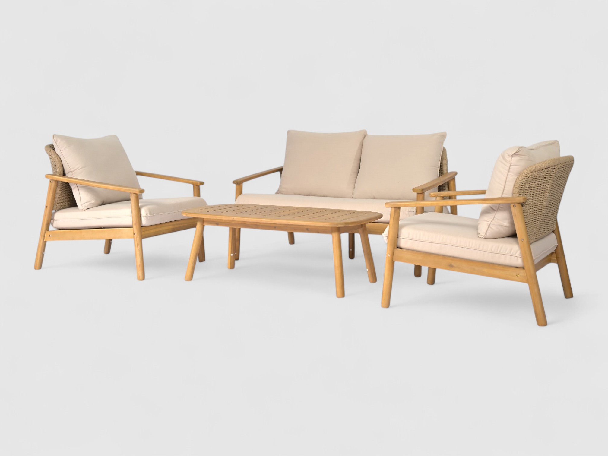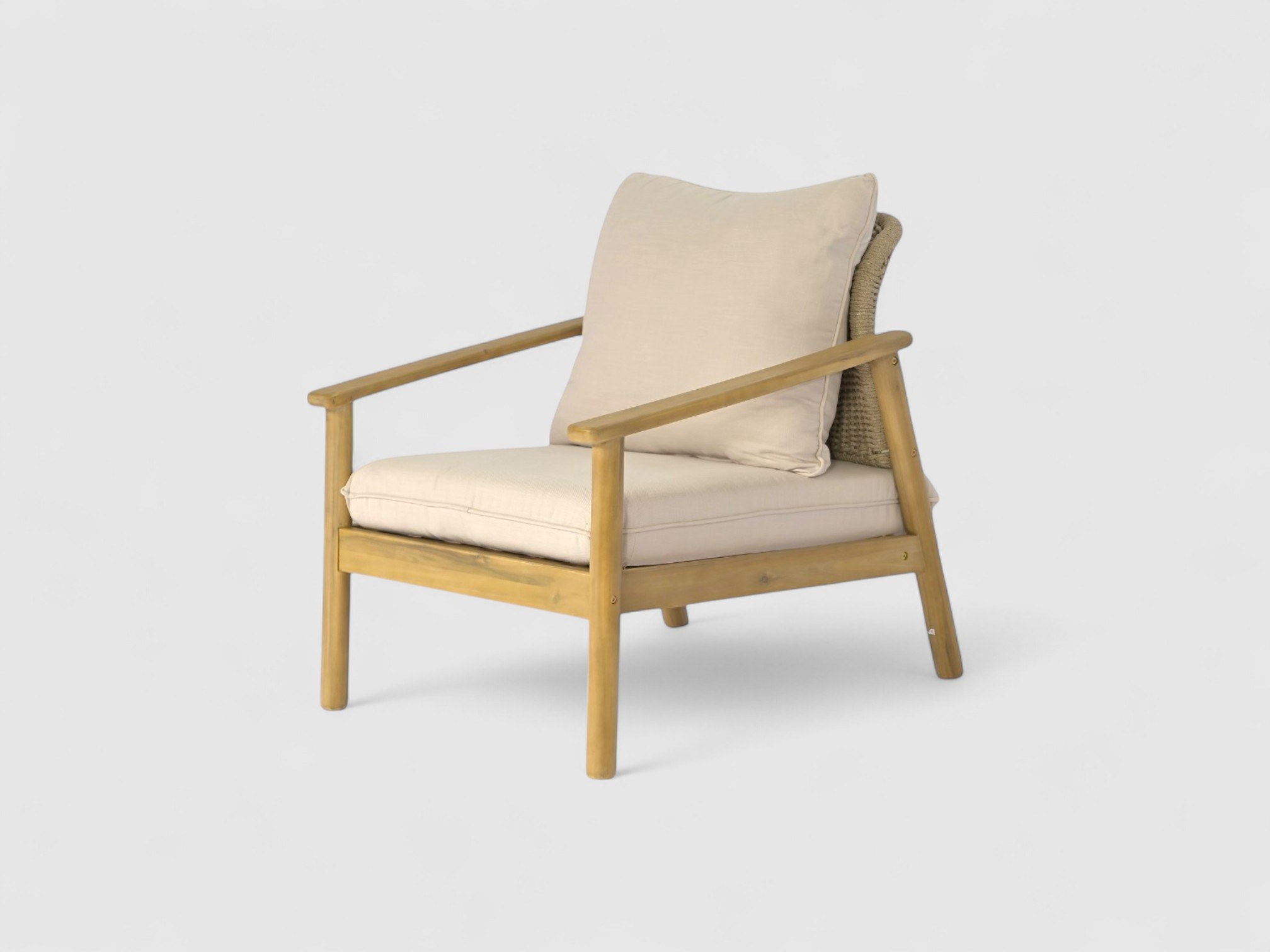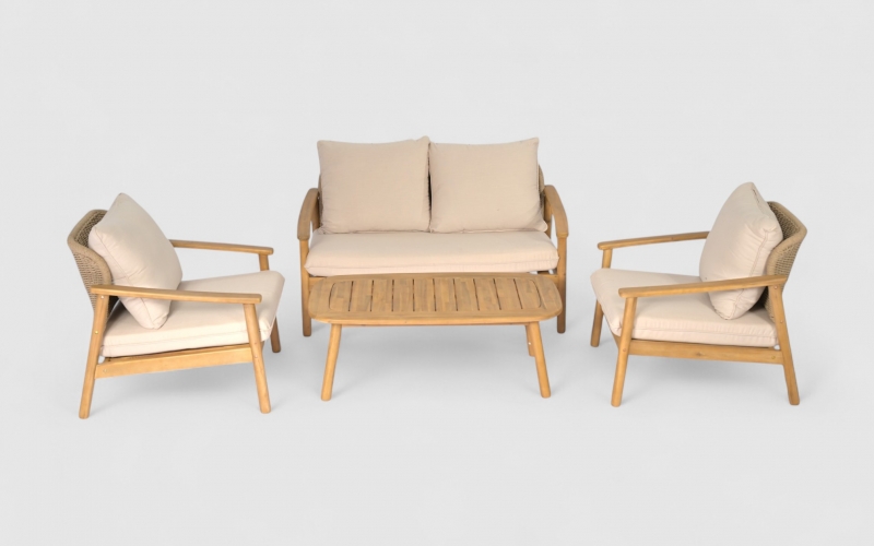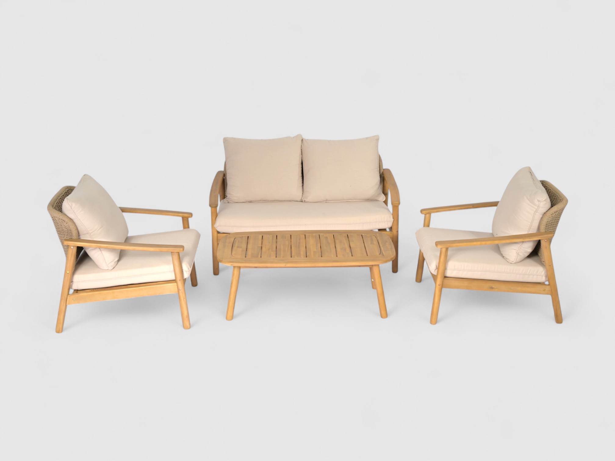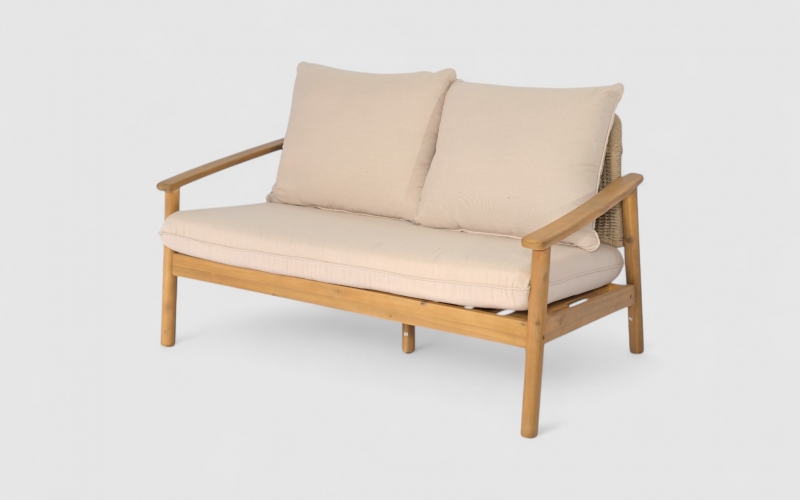 With its rope sides, sturdy acacia frame, and soft cream cushions, it invites you to share relaxed moments with family or friends in a naturally elegant setting.