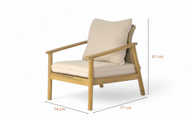 Its generous proportions (74 × 77 × 81 cm) allow you to sink in and unwind — perfect for reading a book, sipping wine, or simply soaking up the sun.