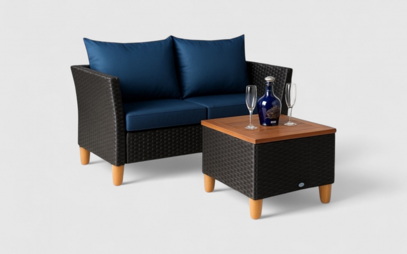 The Nathan Sofa Set 2B includes 1 two-seater sofa and 1 coffee table, meticulously made from 100% FSC-certified Acacia wood and handwoven black wicker plastic, ensuring exceptional strength, weather resistance, and eco-friendly appeal.