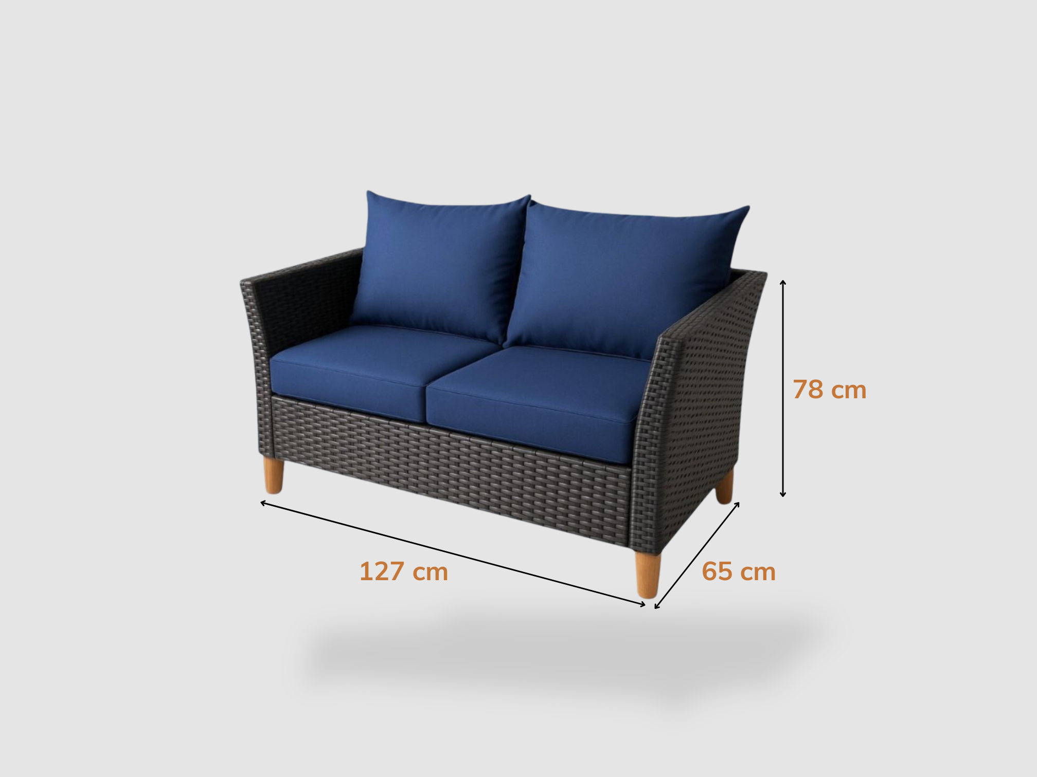 The navy blue cushions, crafted from 230g UV-resistant polyester fabric (3000h) and filled with high-density D20 foam, offer long-lasting comfort and shape retention — 8cm for the seat and 18cm for the backrest.