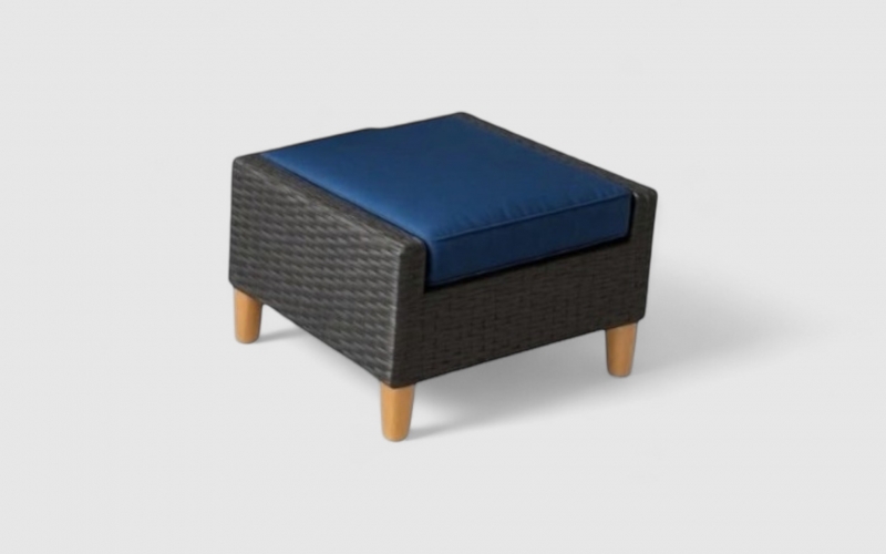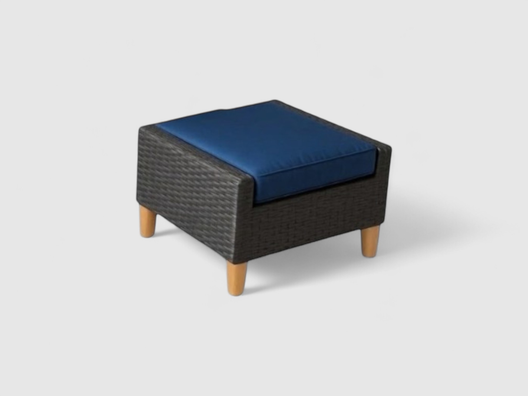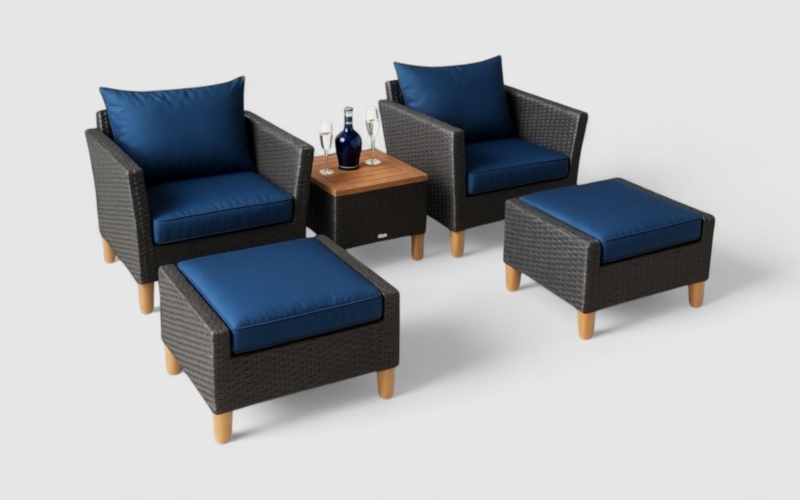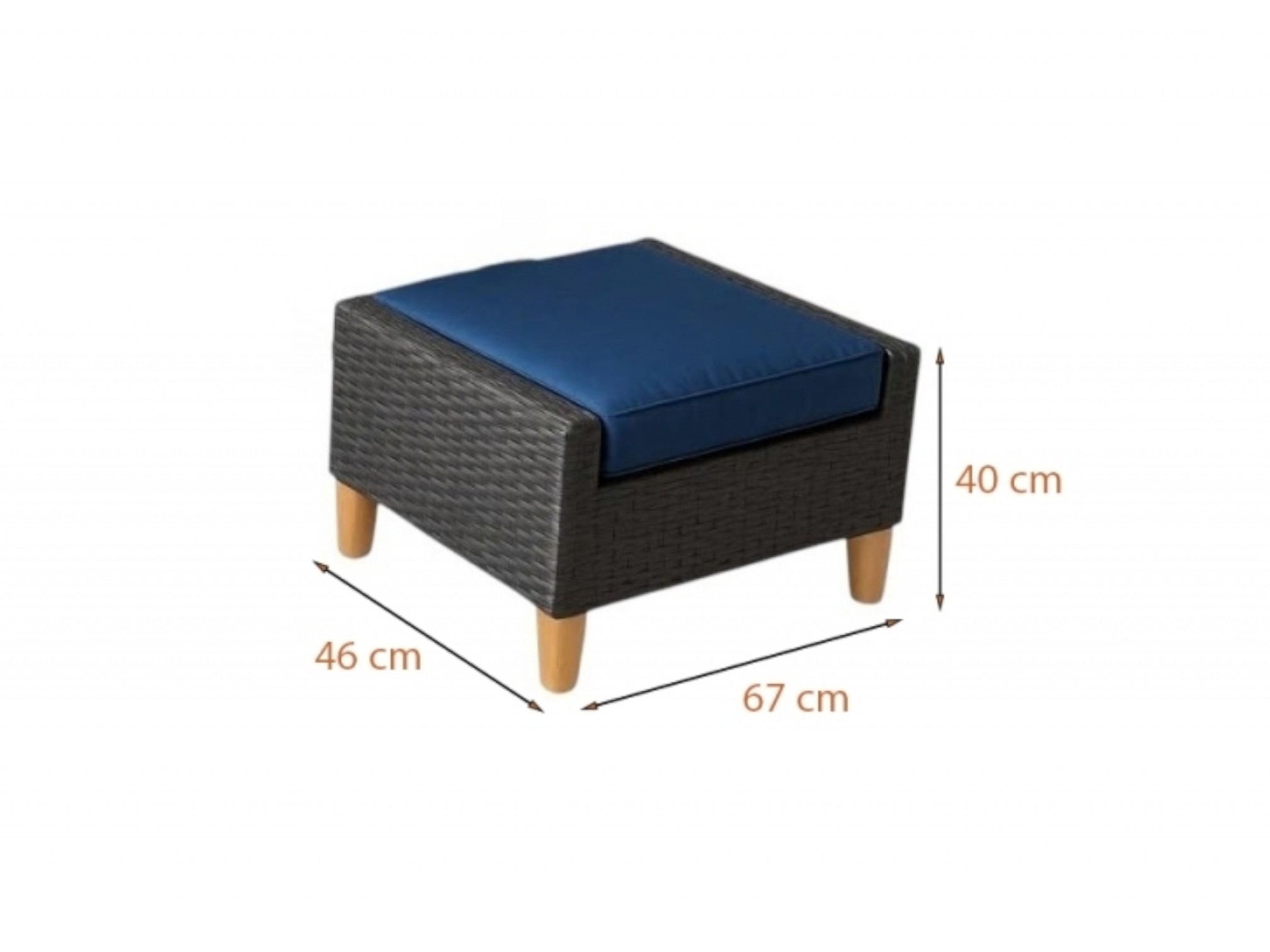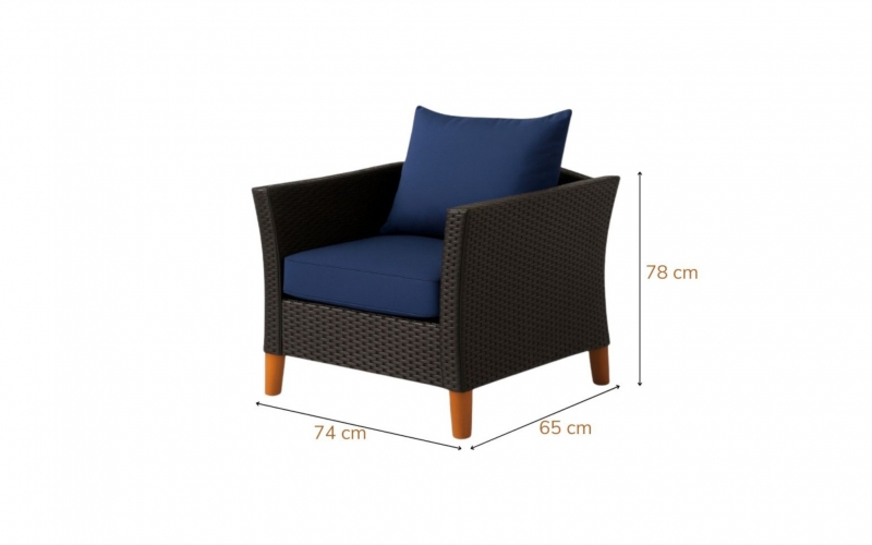 Each piece is paired with navy blue cushions made from 230g UV-resistant polyester fabric (3000h) and filled with high-density D20 foam — 8cm for the seat and 18cm for the backrest — providing exceptional comfort and maintaining their shape over time.
