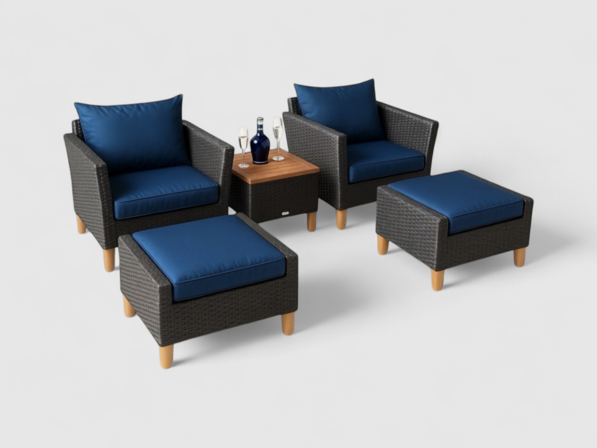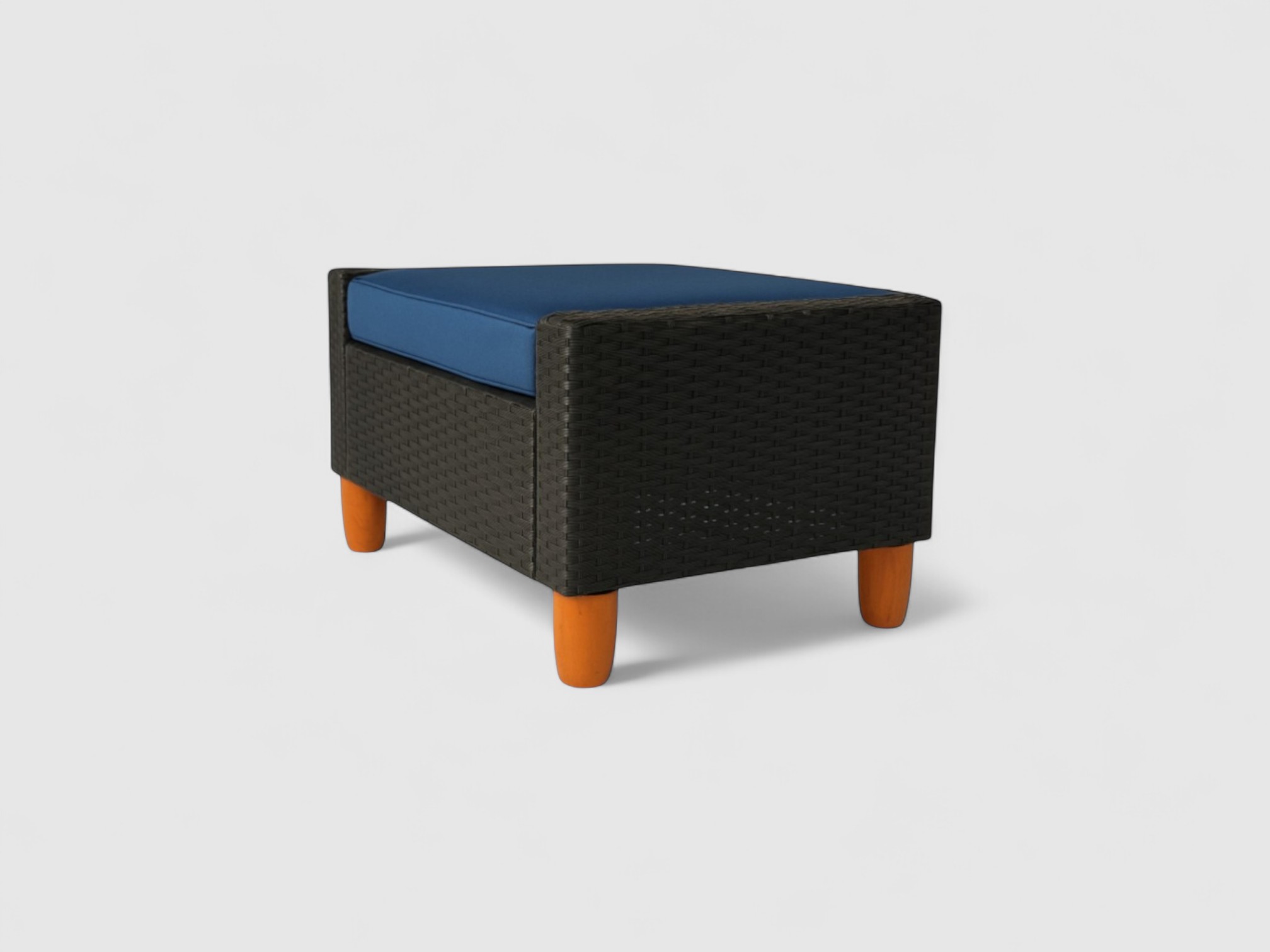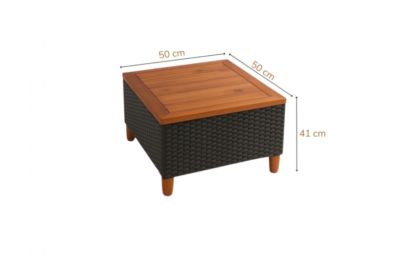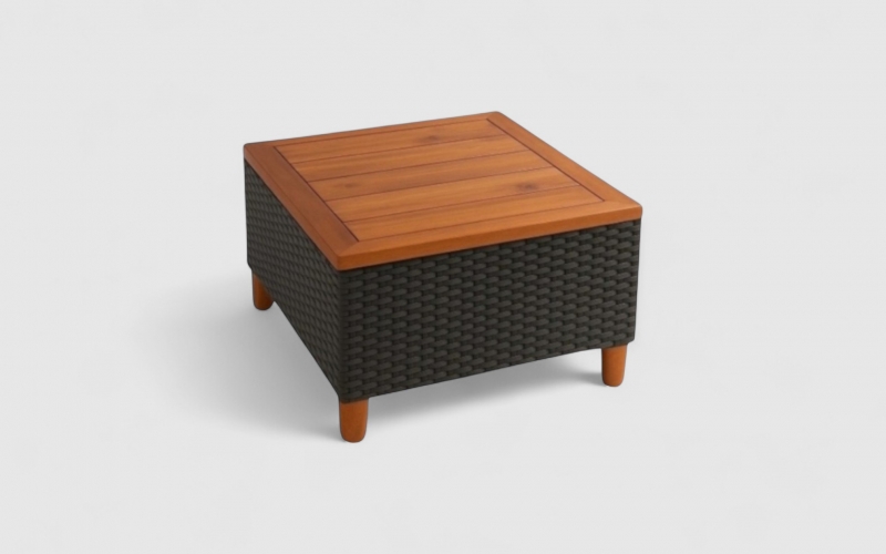 The Nathan Sofa Set 3B includes 1 coffee table, 2 footstools, and 2 single sofas, all crafted from 100% FSC-certified Acacia wood and handwoven black wicker plastic, ensuring long-lasting strength, eco-friendliness, and weather resistance.
