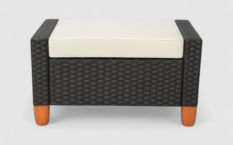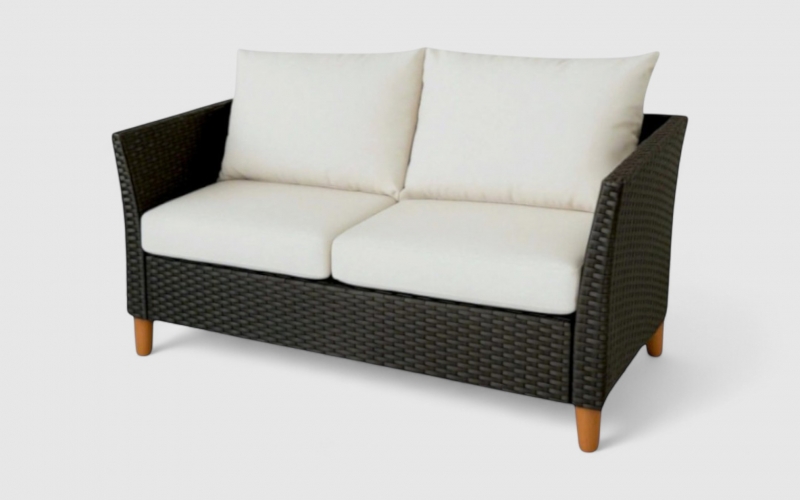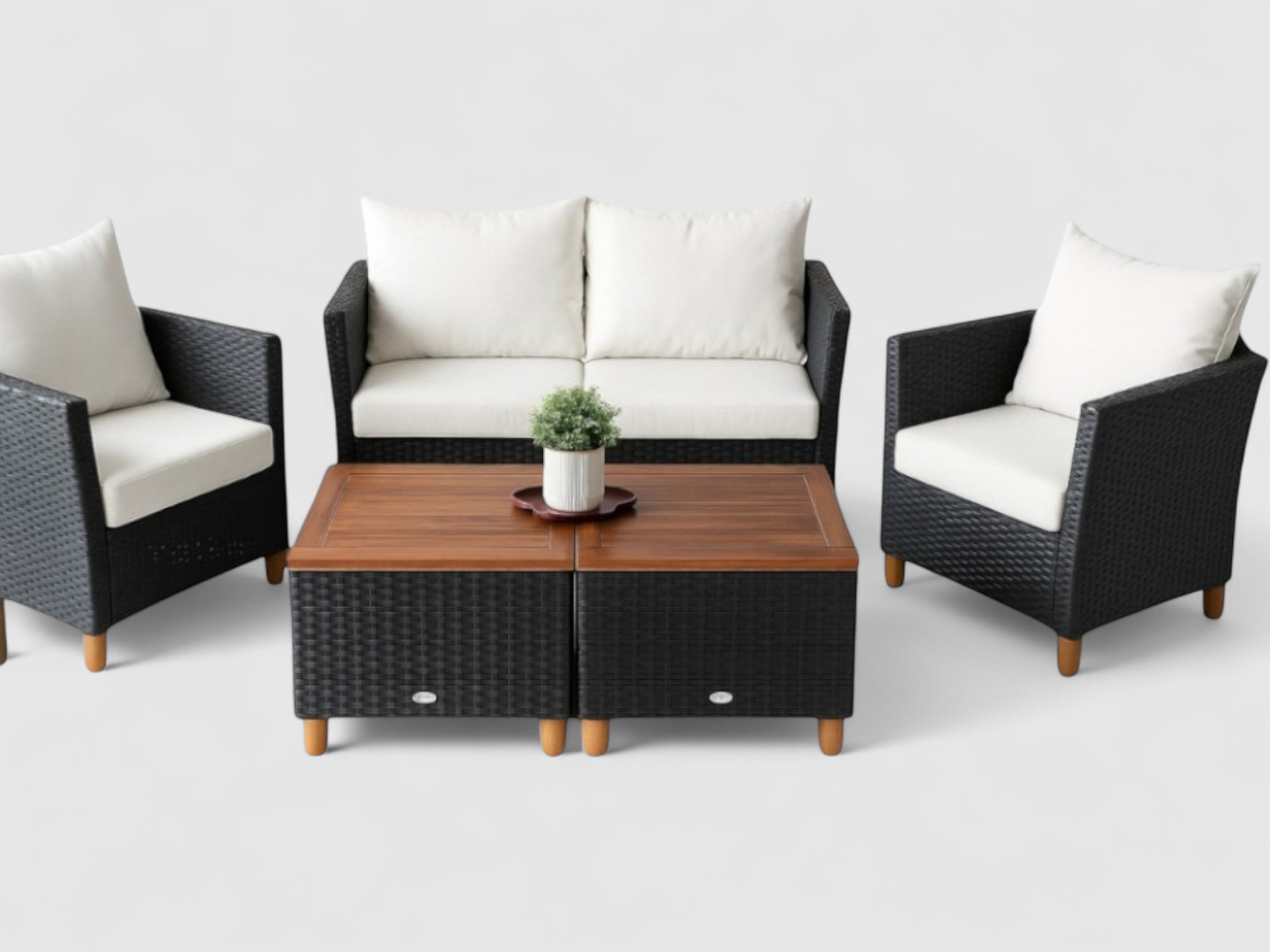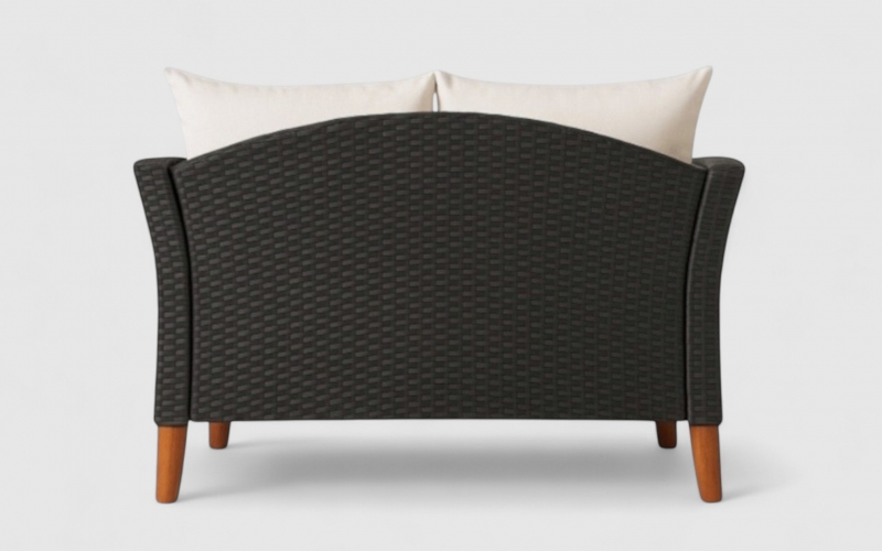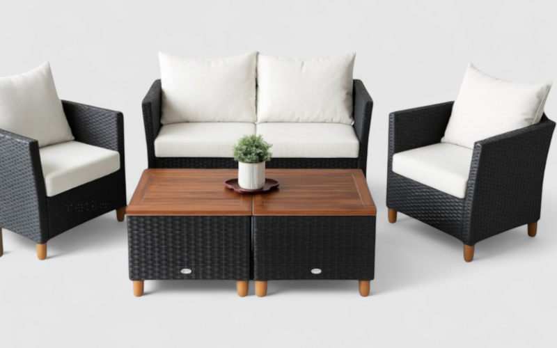 The Nathan Sofa Set 4 brings refined sophistication to your outdoor space. Combining the natural warmth of wood with the durability of black wicker plastic, this set is designed for both comfort and longevity.