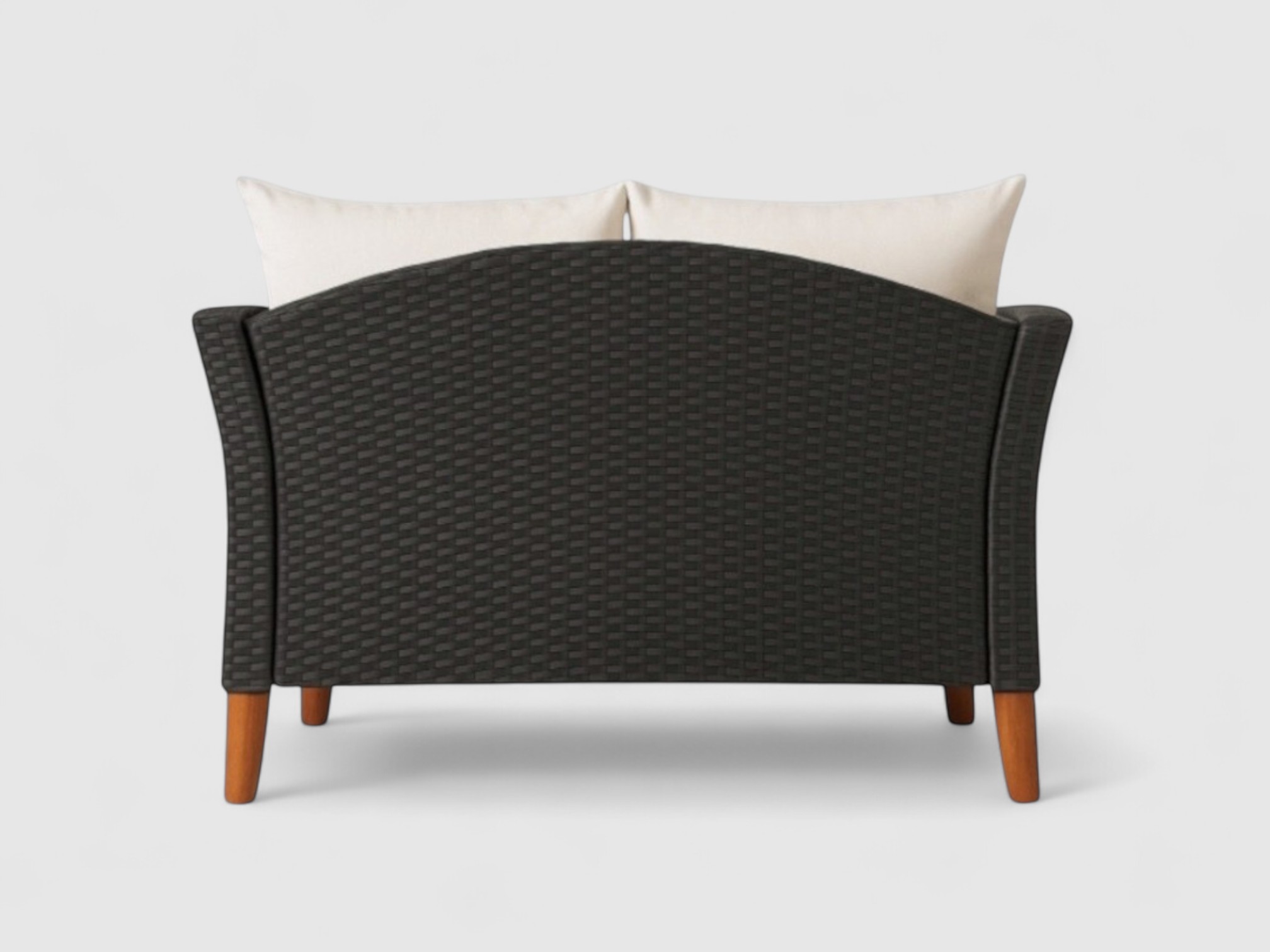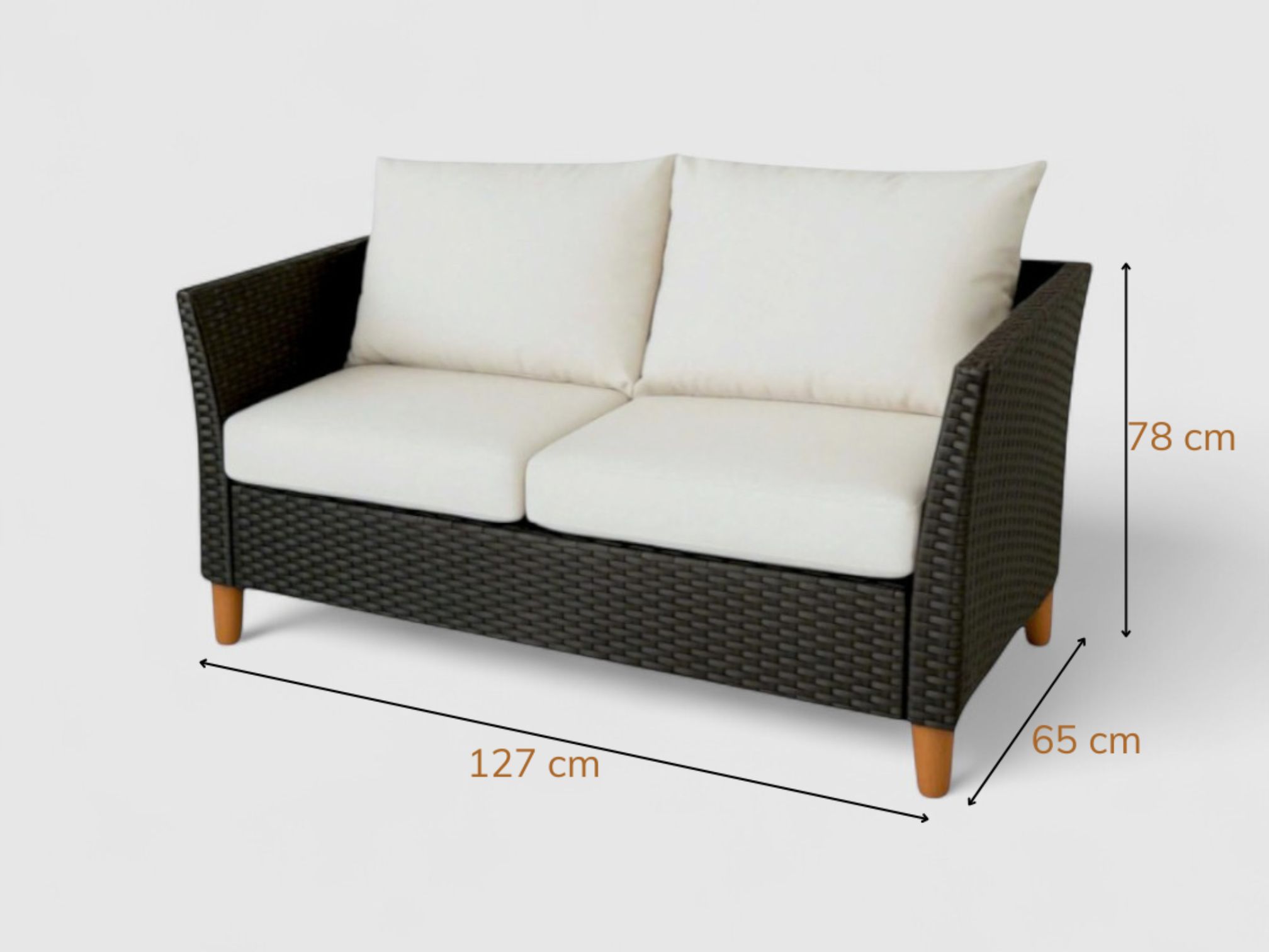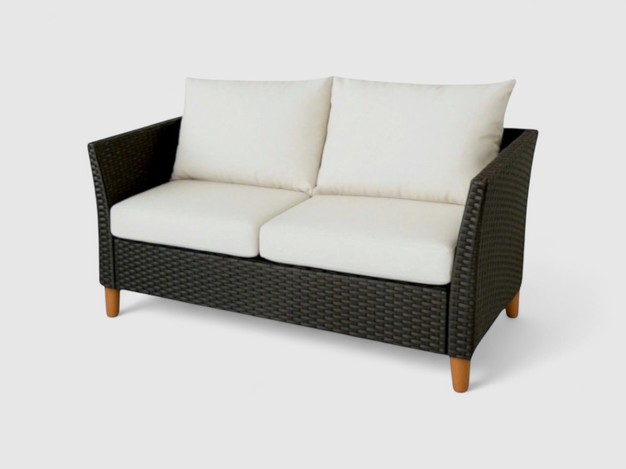 The Nathan Sofa Set 4 brings refined sophistication to your outdoor space. Combining the natural warmth of wood with the durability of black wicker plastic, this set is designed for both comfort and longevity.