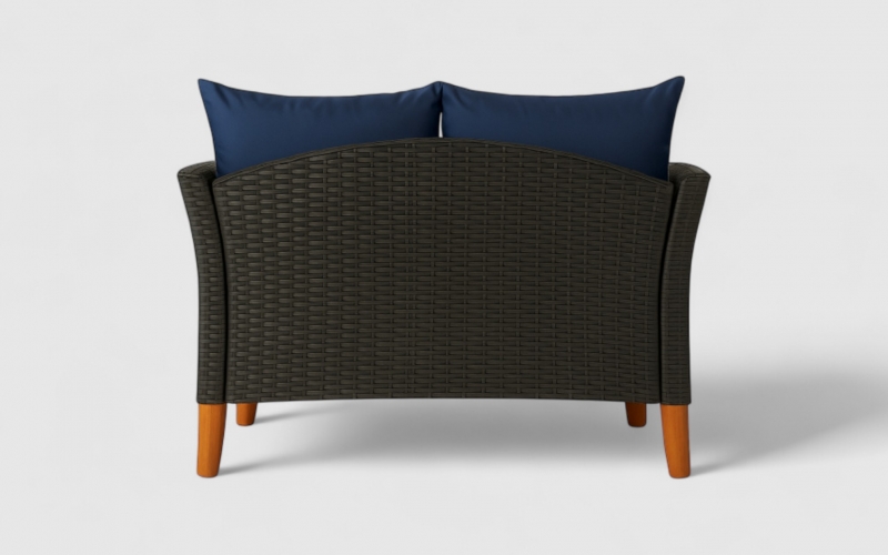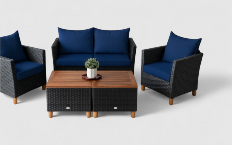 Each piece in the Nathan Sofa Set 4B is crafted from 100% FSC-certified Acacia wood and handwoven black wicker plastic, offering a perfect balance of strength, eco-friendliness, and weather resistance.