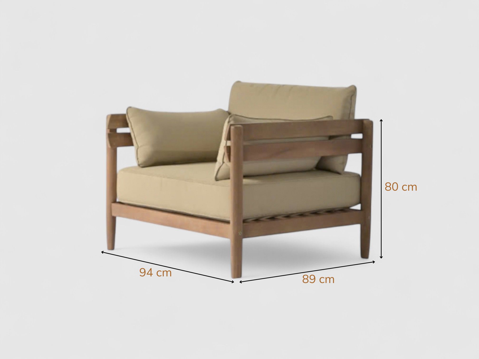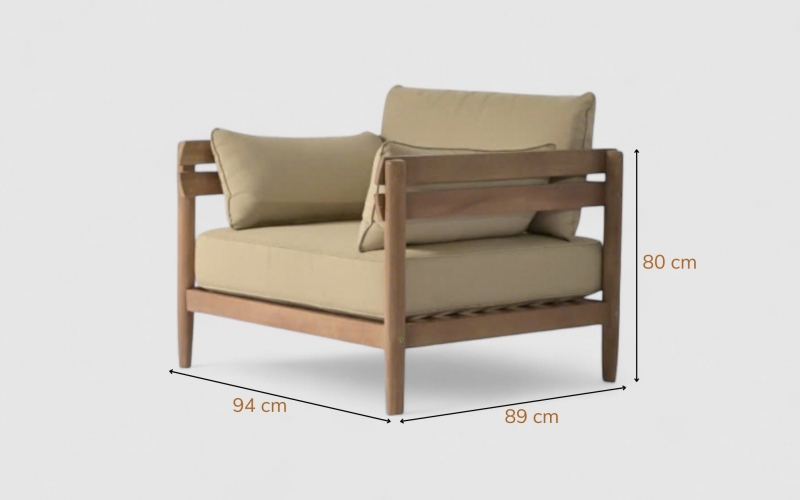 The Ruby 1-Seater Sofa delivers unmatched comfort with its generously padded 20cm seat and back cushions in soft beige tones.